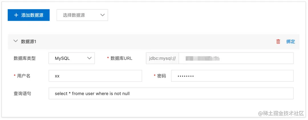 1、添加数据源。在场景编辑-数据源管理中,选择添加 DB 数据源,输入 URL、用户名、密码和 SQL。