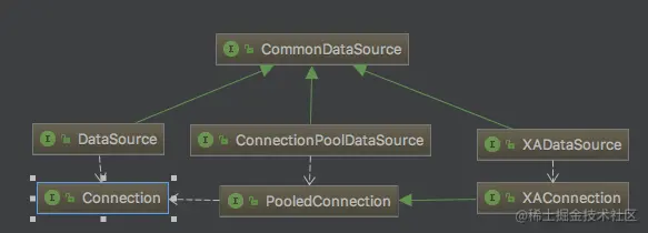 PooledConnection:配合 ConnectionPoolDataSource,由它获取一个池化对象 PooledConnection,再通过该 PooledConnection 间接获取到物理连接。