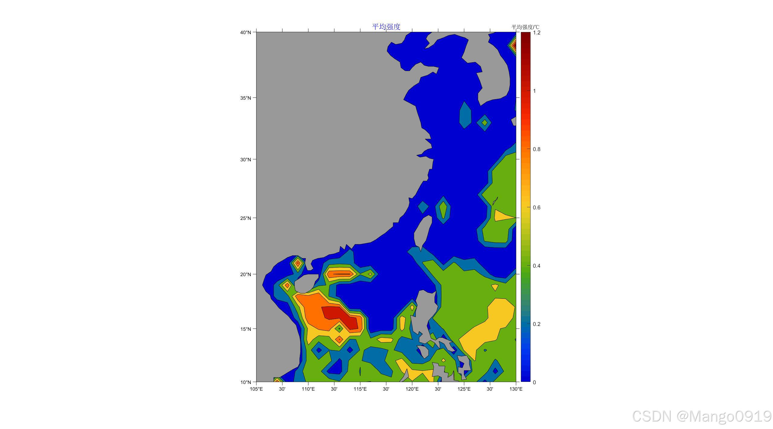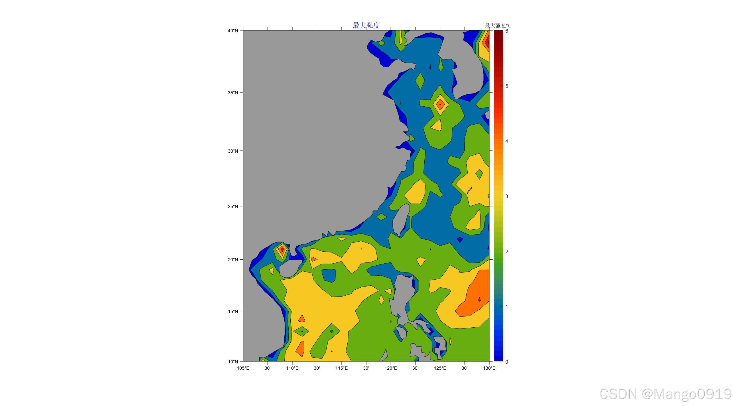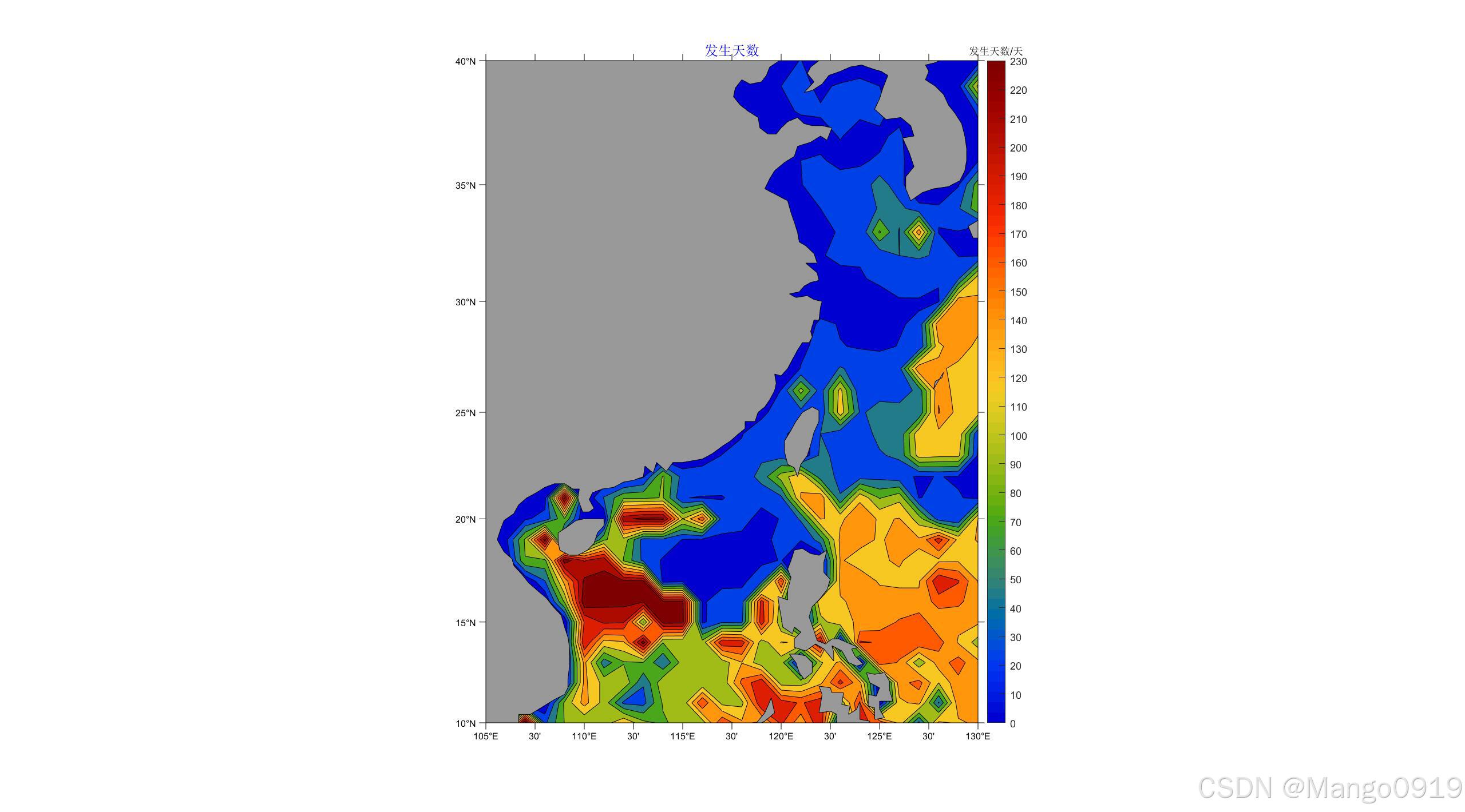 海洋热浪(Marine Heat Waves,MHW)是指在一定海域内发生的海表温度异常偏高的现象。本文针对2023年的中国近海海洋热浪绘制海洋热浪的发生天数,最大强度和平均强度的直观图。