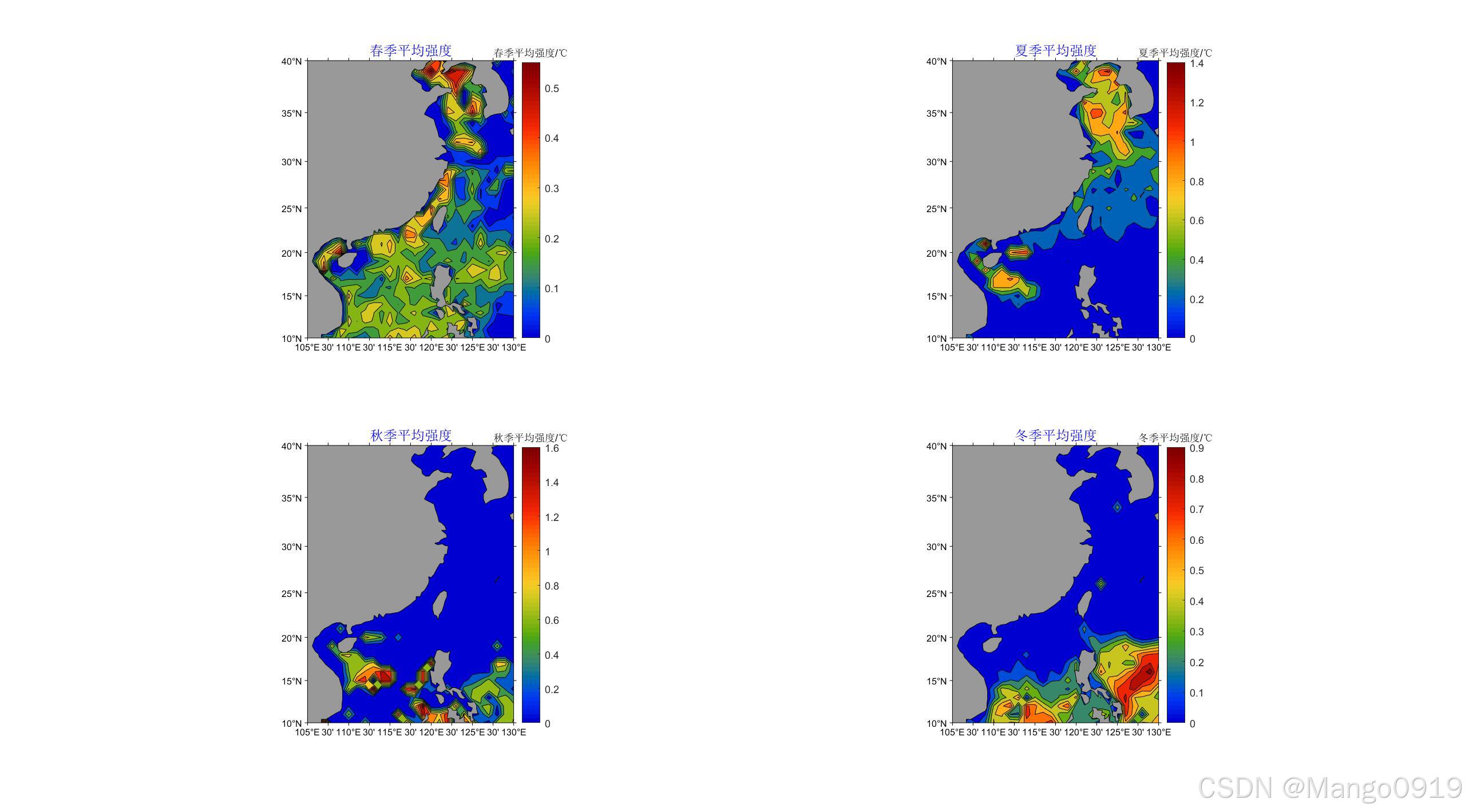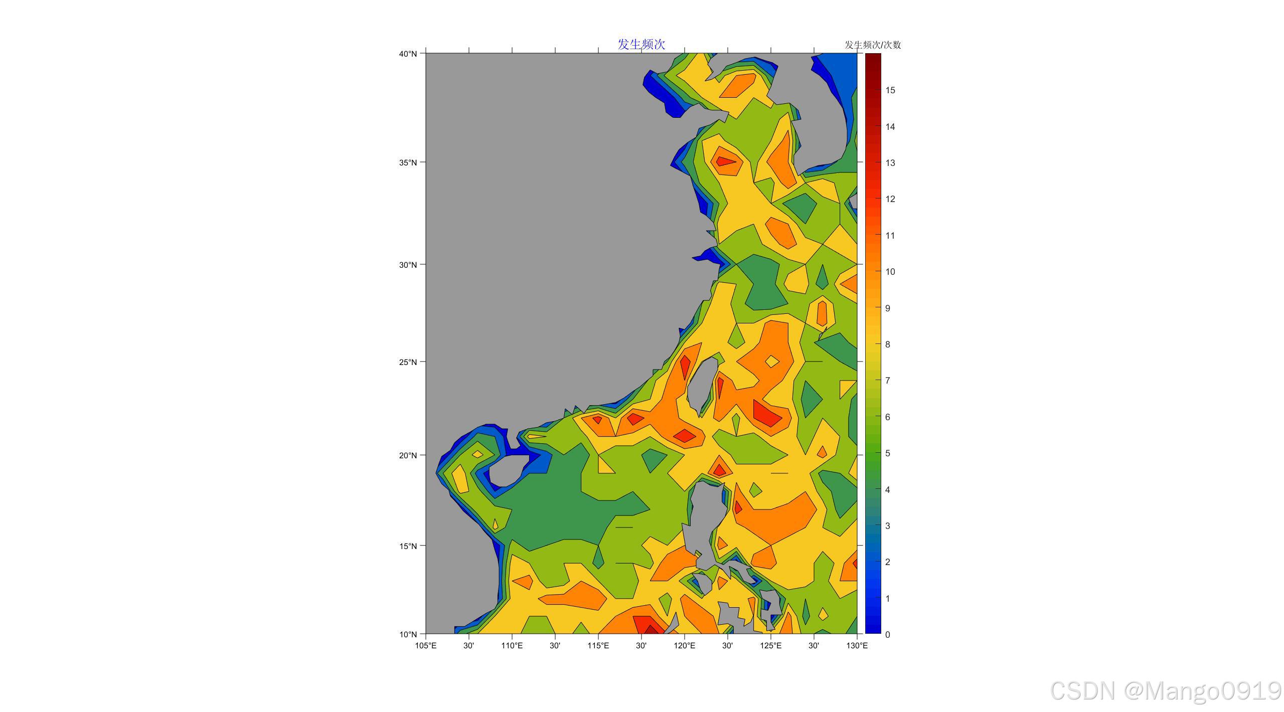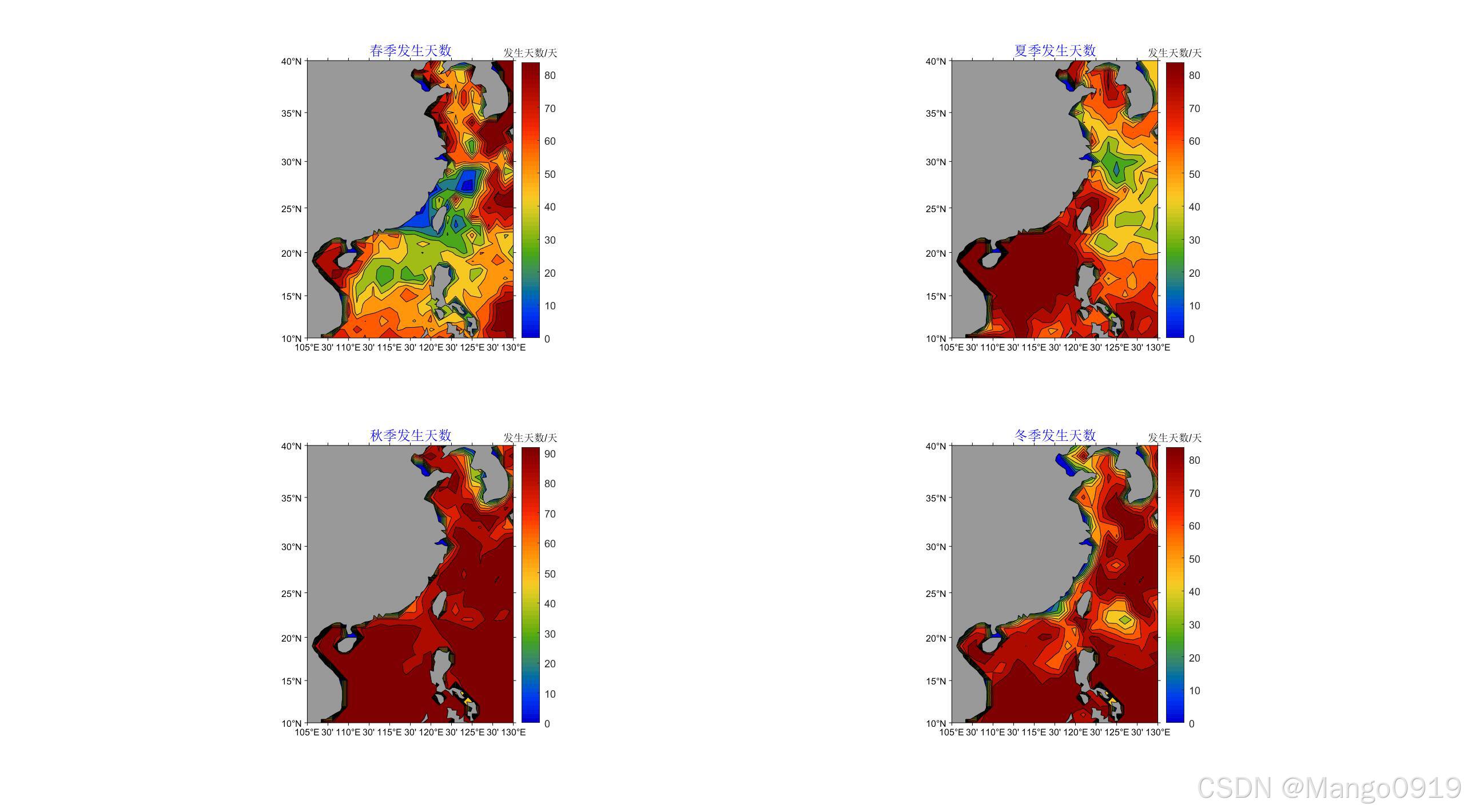 海洋热浪(Marine Heat Waves,MHW)是指在一定海域内发生的海表温度异常偏高的现象。本文针对2023年的中国近海海洋热浪绘制海洋热浪的发生天数,最大强度和平均强度的直观图。
