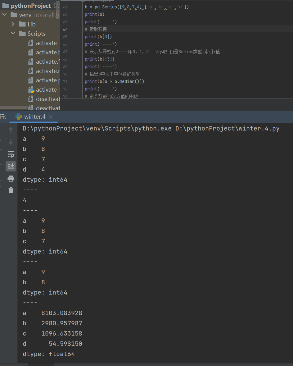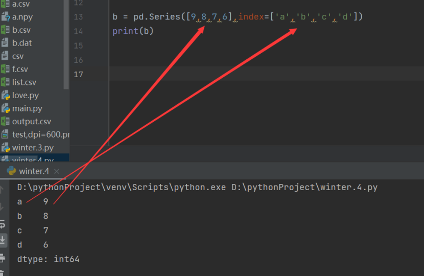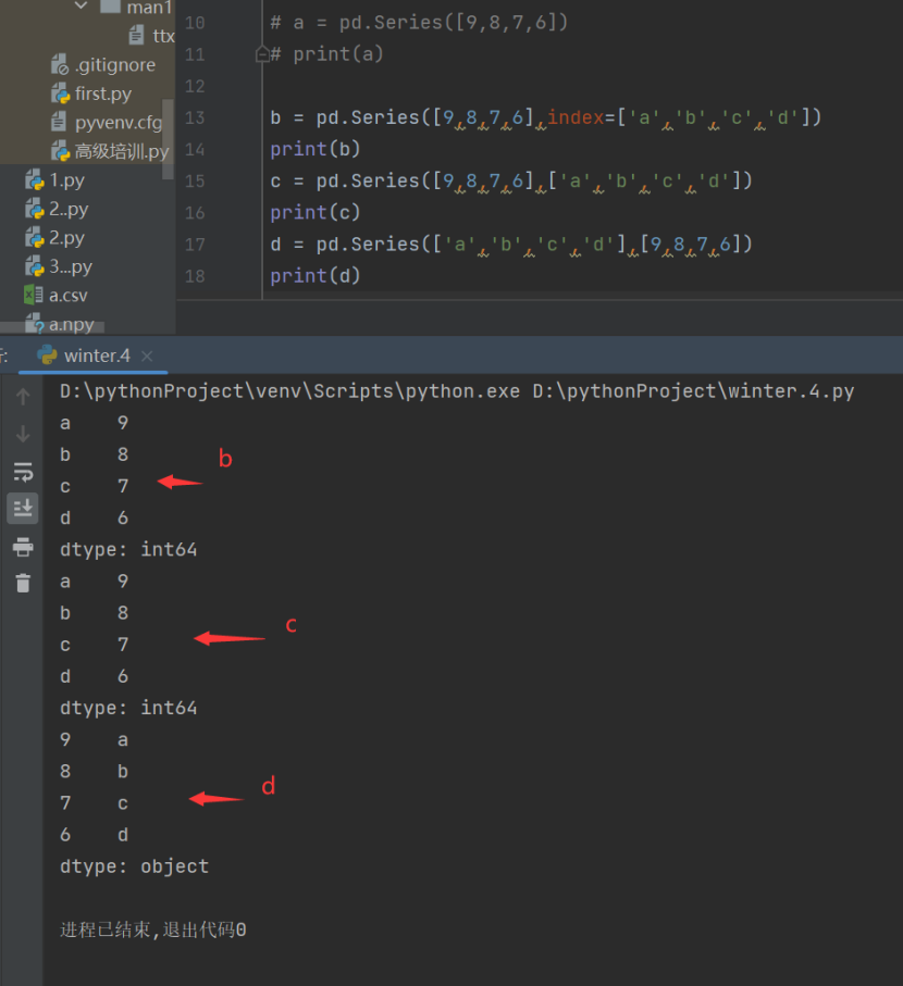 b = pd.Series([9,8,7,4],['a','b','c','d'])