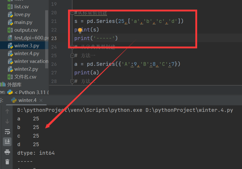 s = pd.Series(25,['a','b','c','d'])