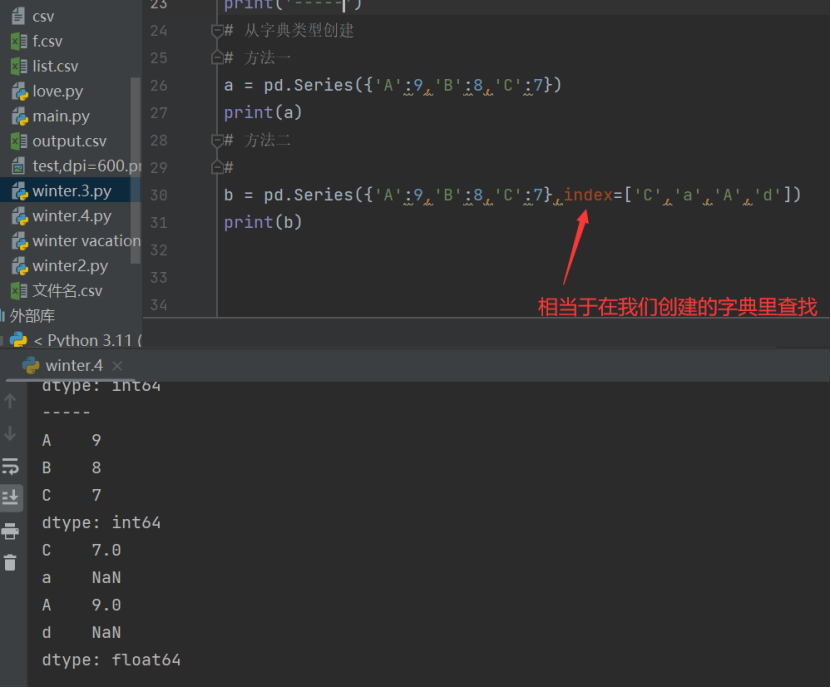 b = pd.Series({'A':9,'B':8,'C':7},index=['C','a','A','d'])