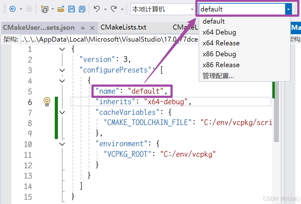 管理配置这里需要选择和 `CMakeUserPresets.json` 的 "name" 字段相同的配置。