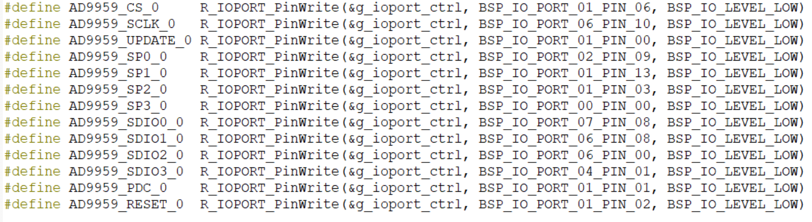 硬件连接:说明AD9959与主控芯片的引脚连接(如SCLK、SDIO、CS等)。