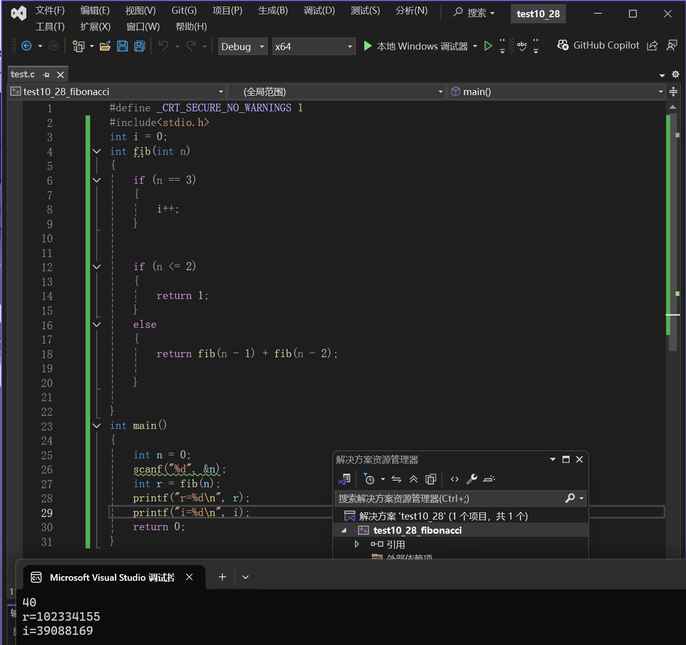 同样是利用递归,因为每个斐波那契数都等于前两个斐波那契数之和,所以采用递归思想解决,但是思考一下稍微极端一点的情况,就是比如要求第40,50个斐波那契数