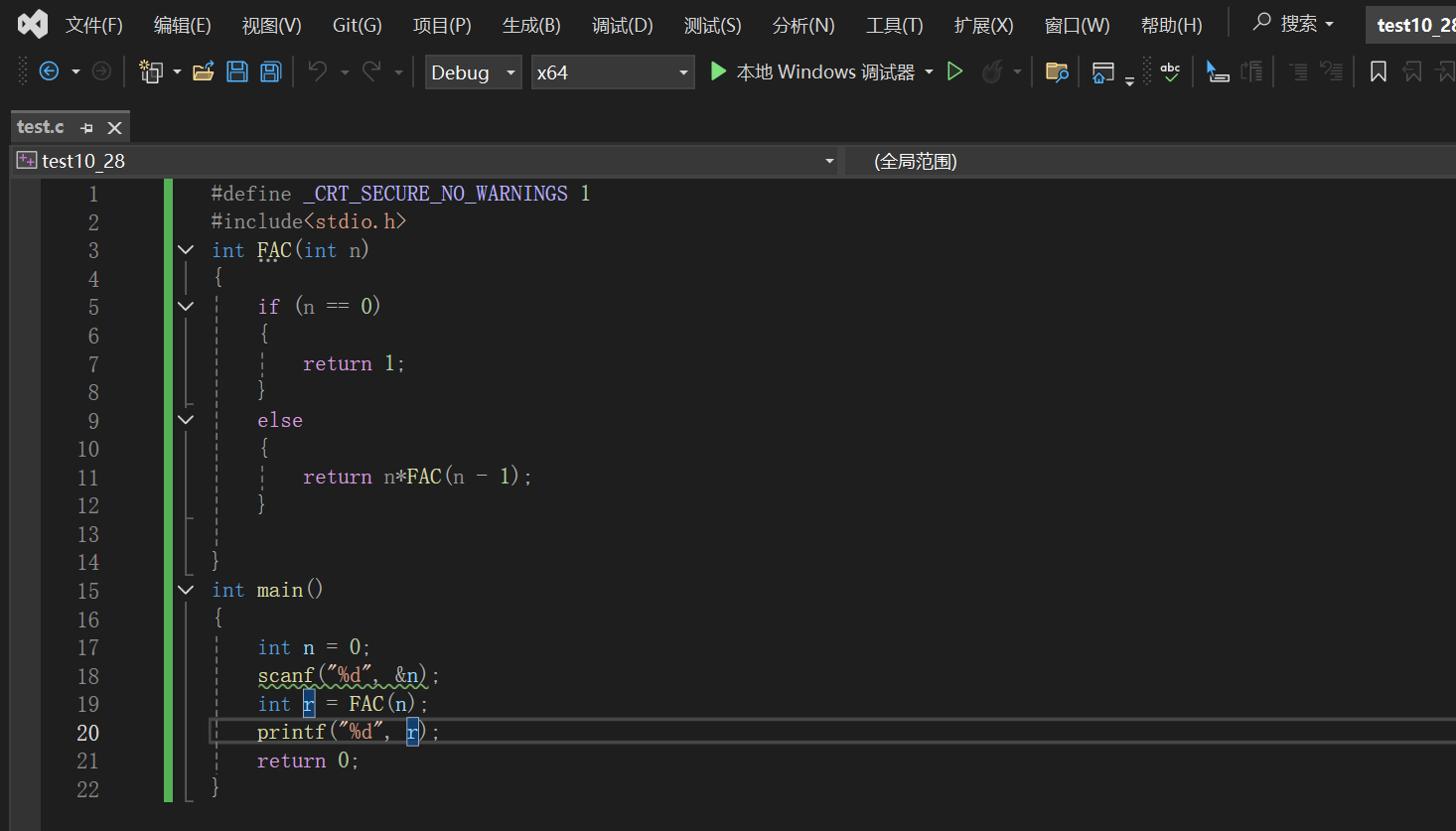 n!=n*(n-1)! (n-1)!=(n-1)*(n-2)!.....以此类推,就可以实现“大事化小”的想法,而用函数表示的话如下:假定FAC(n)=n! ,FAC(n)=n*FAC(n-1), FAC(n-1)=(n-1)*FAC(n-2).....这就是递推的具体函数实现,还是比较好理解的,所以接下来我用代码实现一下。