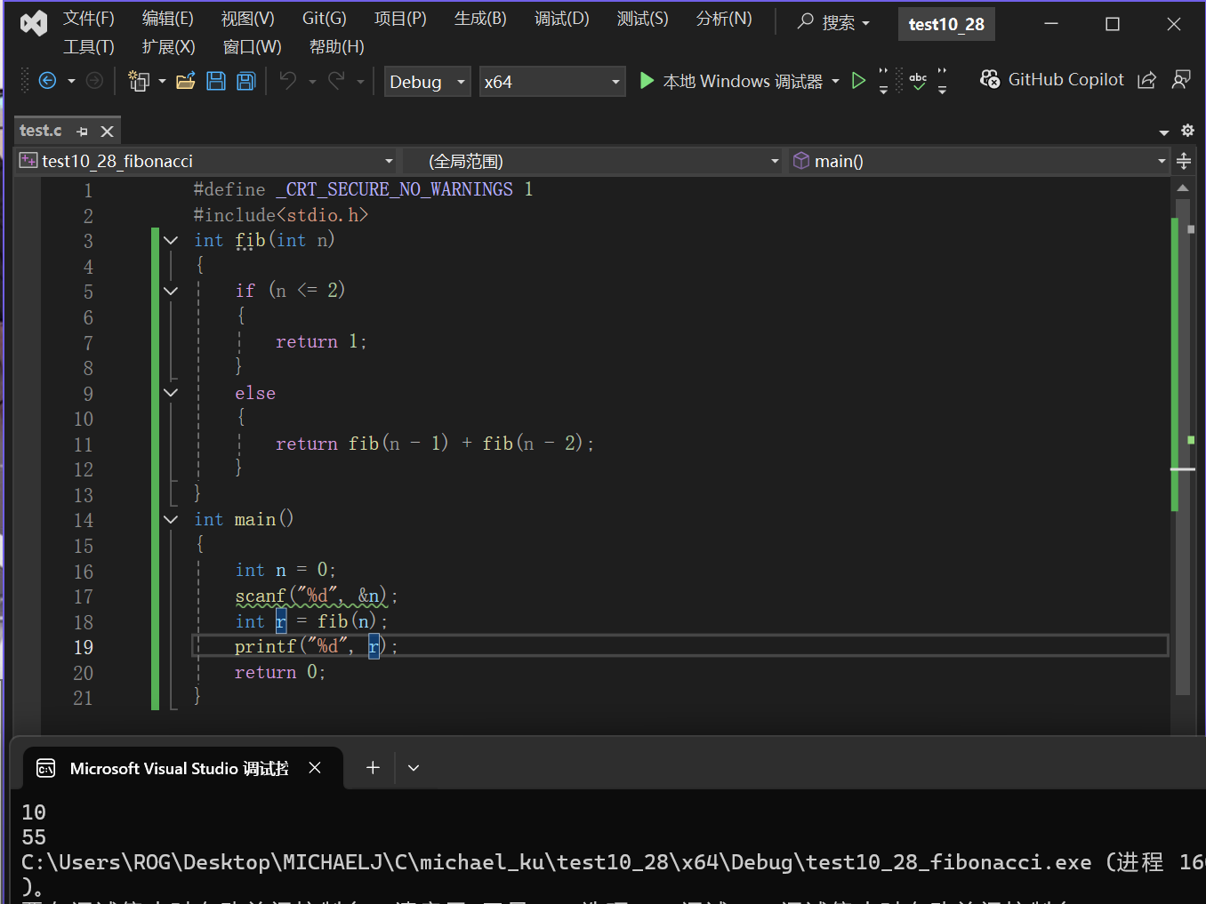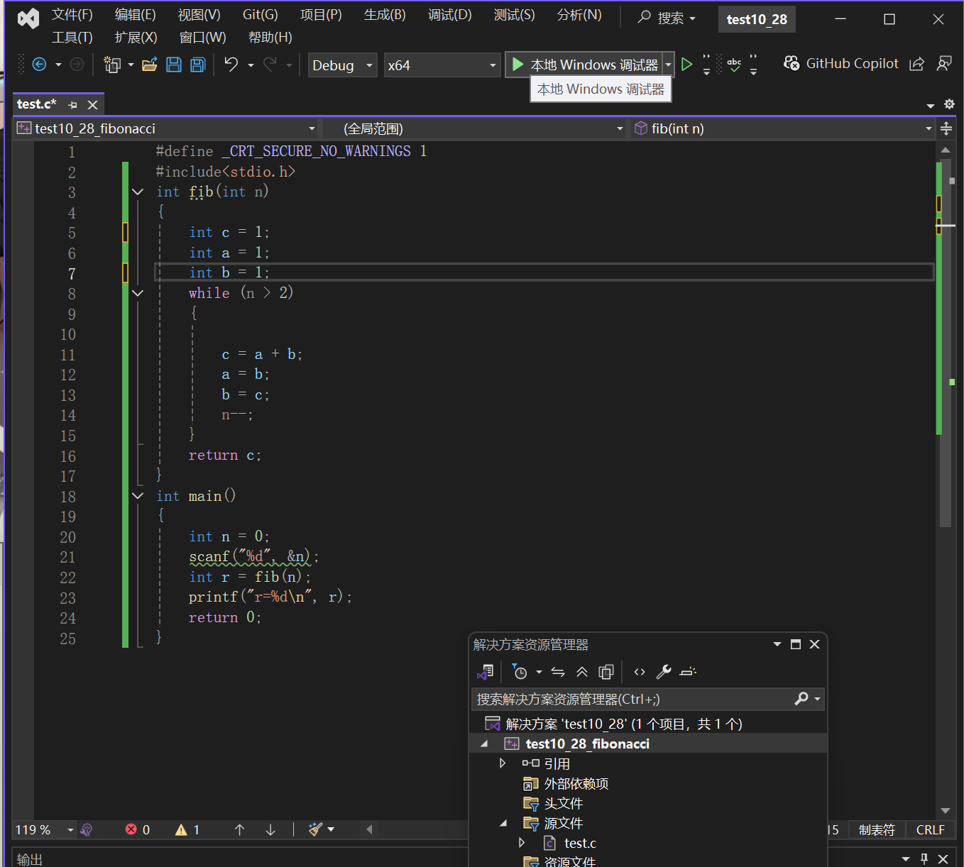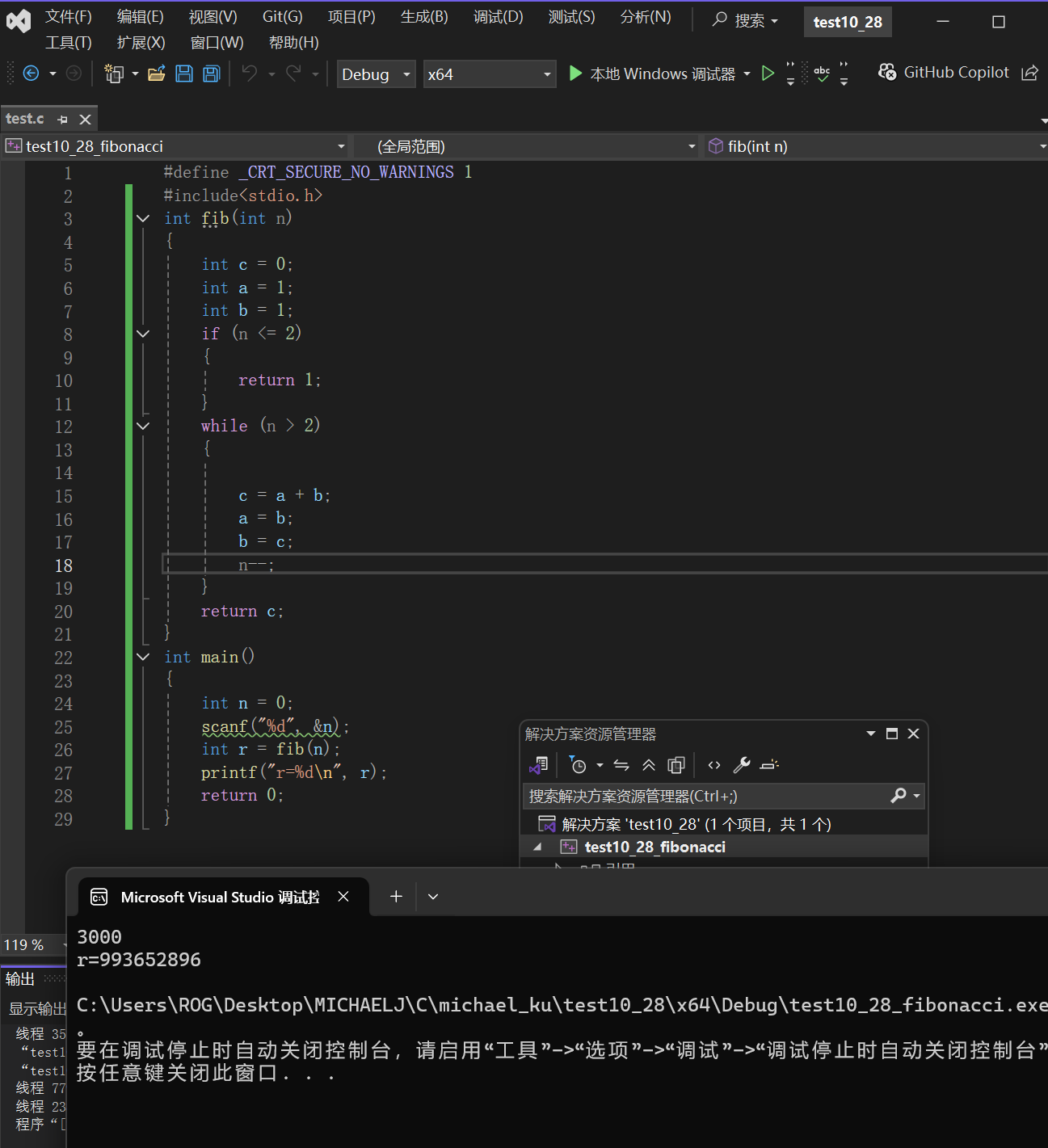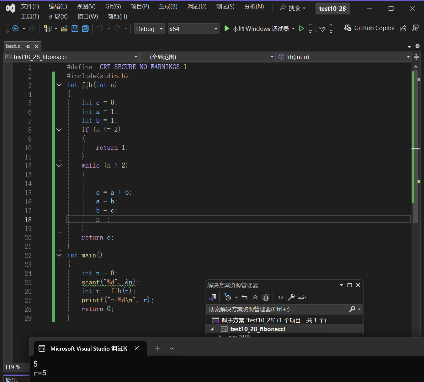 这张图中,因为斐波那契数列最开始两个值为1,初始化a,b为1,然后经过一系列赋值操作,使c,也就是第n个斐波那契数始终为前两个数之和,而这个n--呢,是因为比如说,第三个斐波那契数,需要循环一次,第四个循环两次,第五个循环3次...差值始终为2,所以只要在n>2时进入循环就可以实现斐波那契数的计算。