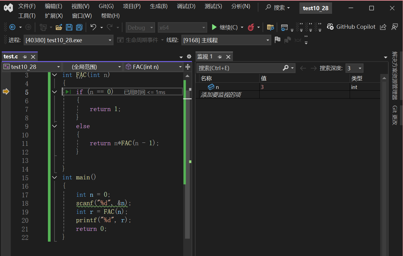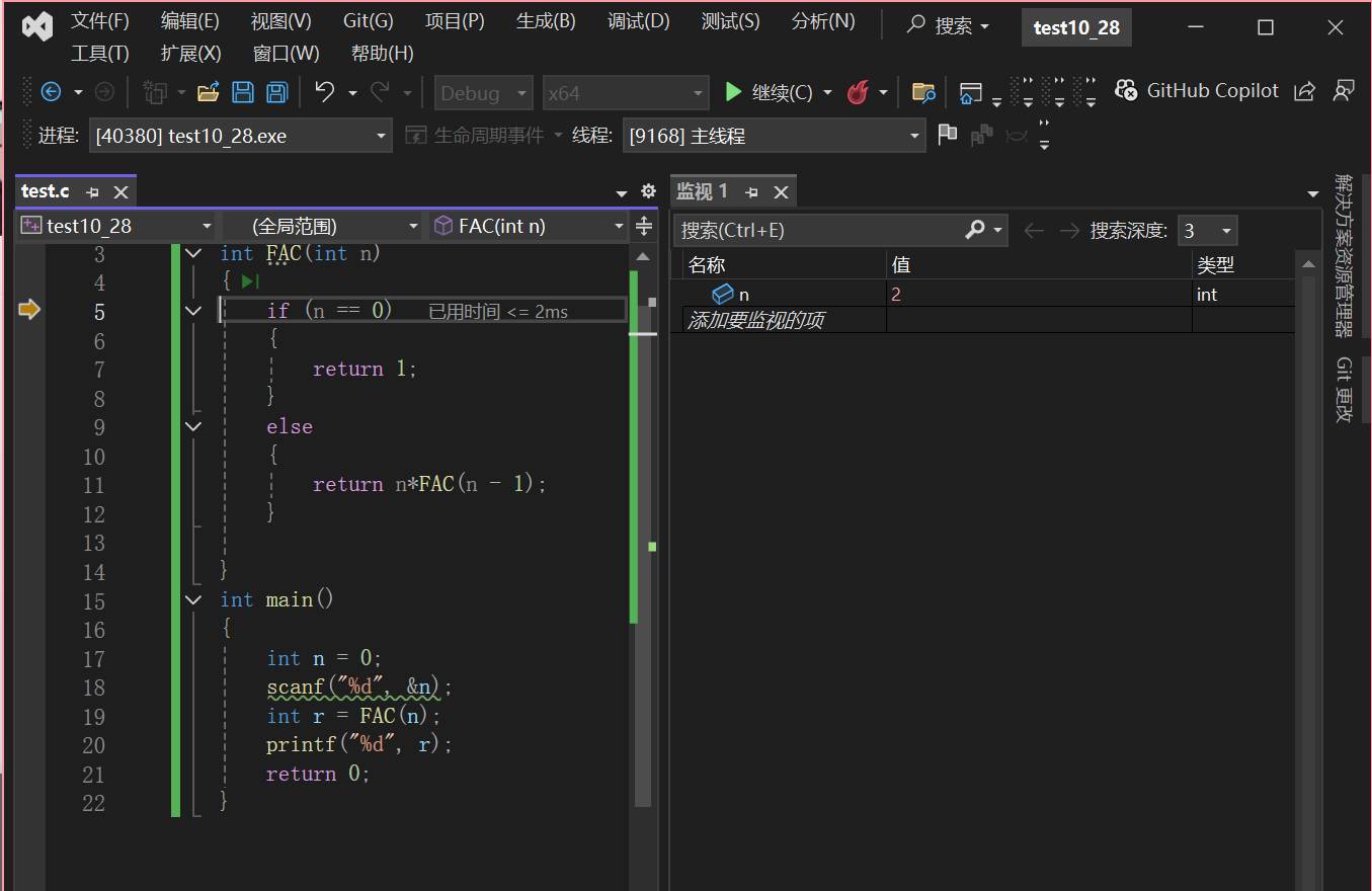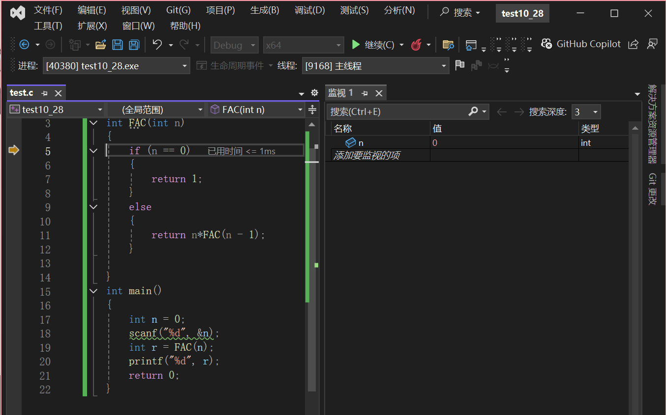 这张图中,由于0!为1,所以当形参n为0时返回1,其余时候就是实现函数递归的过程,为让过程更加直观,这里还是采用监视的方式。