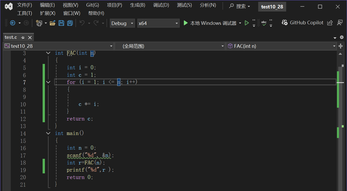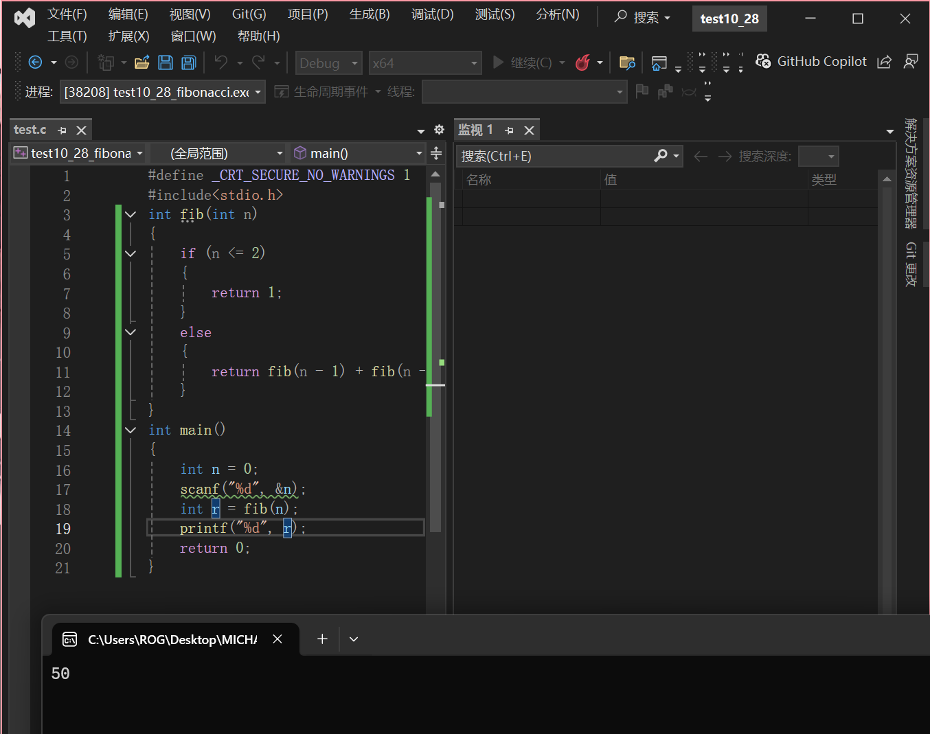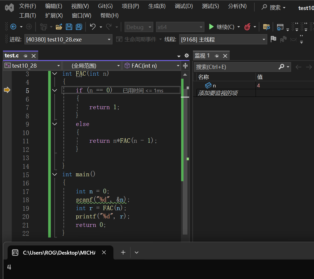 这张图中,由于0!为1,所以当形参n为0时返回1,其余时候就是实现函数递归的过程,为让过程更加直观,这里还是采用监视的方式。