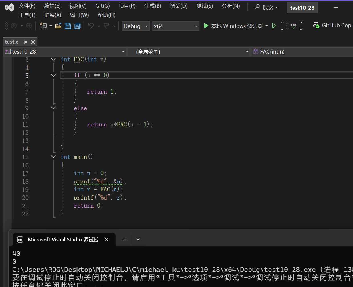 回归开始的时候,n=0,这个时候就会return 1,然后,n=1,return n*FAC(n-1,也就是return n*FAC(0),而FAC(0)为1,也就是return 1,然后,n=2,return n*FAC(1),也就是2*1,然后n=3,n=4,以此类推,整个的计算过程就是1*2*3*4,也就实现了计算阶乘。