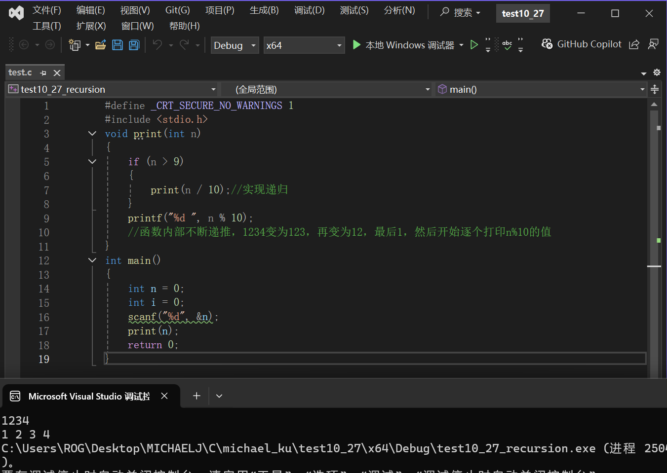 同样在print函数内部调用,也就是函数递归的方式,限制条件为n>9,例如我输入1234,print(1234/10),即123,继续print(123/10)=12,最后变为1,时,限定条件不成立,跳出if语句,打印n%10的值,也就是1,然后回归12,n%10为2,以此类推,打印出1 2 3 4.