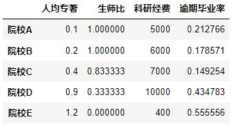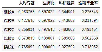 data_normalization=data_normalization[['生师比','人均专著', '逾期毕业率', '科研经费']]