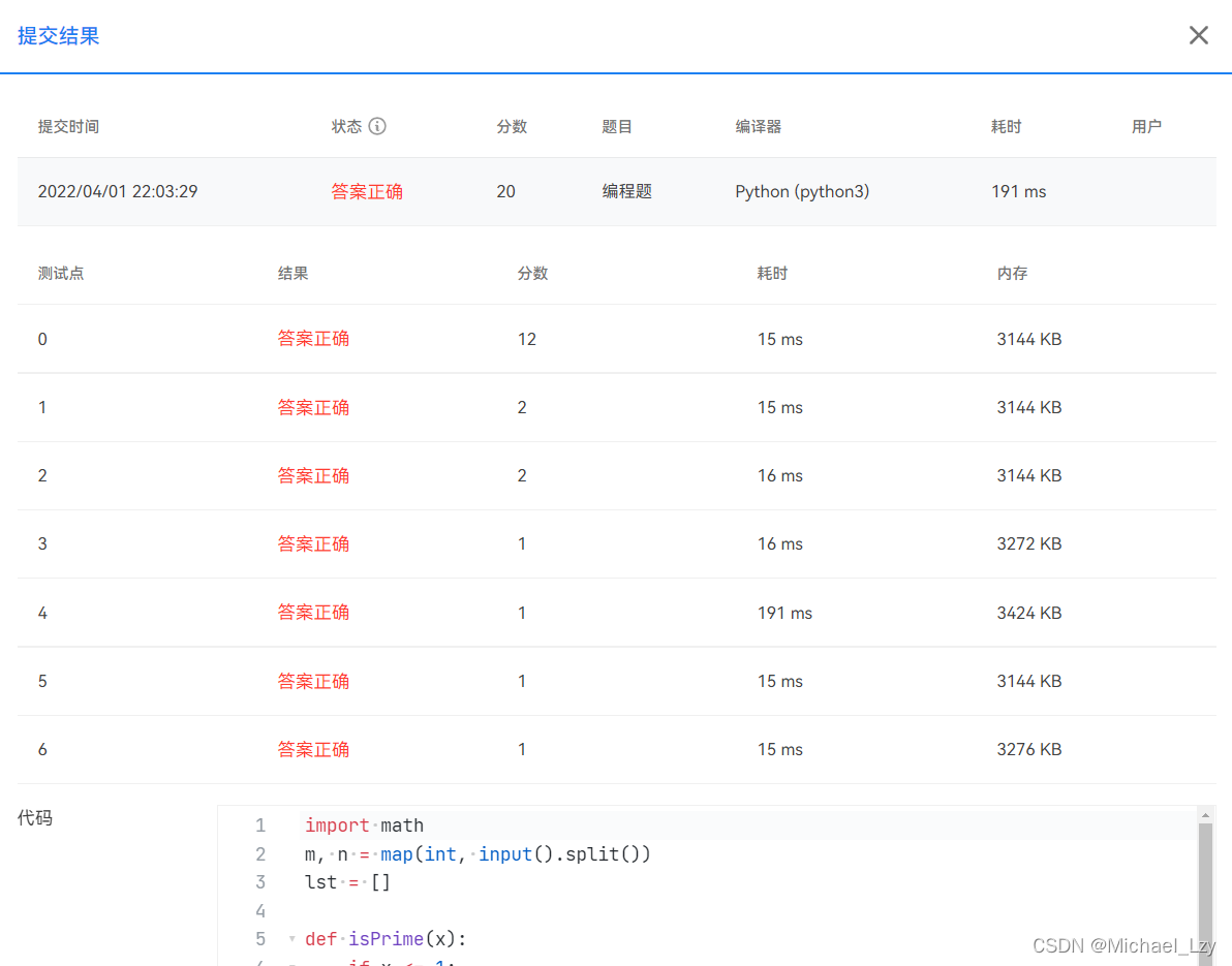 PAT乙级1013数素数-python实现(20分) 先贴个图:一开始判断素数的时候,只是循环到数的开平方,最后测试点4超时,只拿了19分,下面是19分的代码,最后有20分的代码。import mathm, n = map(int, input().split())lst = []def isPrime(x):# 判断素数 if x <= 1: return False for i in range(2, int(math.sqrt(x))+1): if x % i == 0: