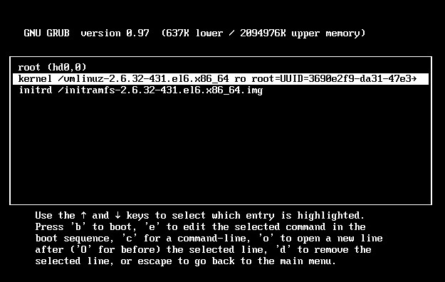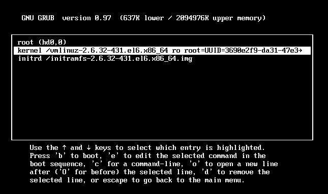 (3)选择第二项操作系统的内核“kernel”,按"E"键(在引导顺序编辑选定的命令)。