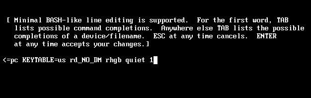 (4)在 “rhgb quiet”后面间隔,输入“1”或者“single”,按Enter键保存。(向内核传递启动参数,进入单用户模式)