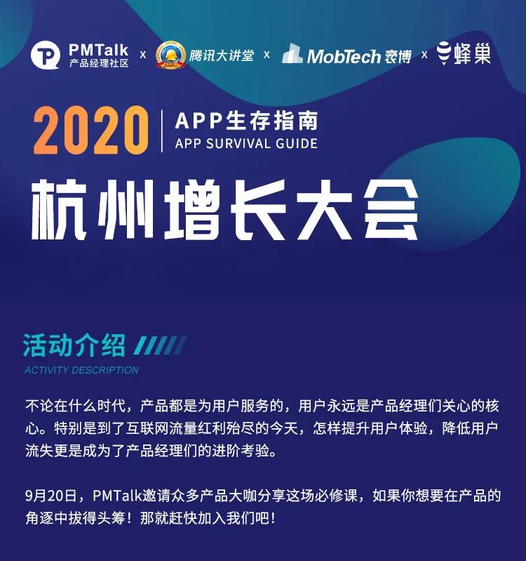 继8月22日上海场沙龙后,MobTech袤博携手PMTalk杭州站增长大会邀请了来自微拍堂、MobTech袤博、蚂蚁金服等大厂产品经理,他们有着丰富的产品实践,【快来文章底部扫码报名】杭州站活动,与大厂产品大咖们一起交流,提升个人发展、发散产品思路吧~