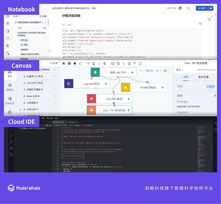 平台为用户打通了底层架构,零基础的科研人员无需任何软件安装及环境部署,随时随地登录账号即可开始科研分析。针对“学科 x 计算机”或数据驱动的“学科 x 学科”的融合研究,ModelWhale 同时提供 了 Notebook 交互式编程、 Canvas 拖拽式编程和 CloudIDE 三种开发模式,契合不同工程能力研究者的分析工作需求。