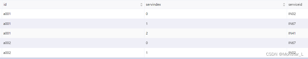 用法1:explodeselect id, -- id tab.serviceId -- 服务id from ( SELECT 'a001' as id,'IN02,IN67,IN41' as serviceIds union all SELECT 'a002' as id,'IN67,IN02' as serviceIds ) aa lateral view explode(split(serviceIds,',')) tab as serviceId limit 100