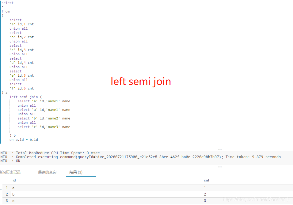 1、left semi join 是只传递表的join key给map阶段,所以最终的select结果数据只有左表数据。