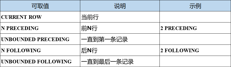 )<PARTITION BY clause> ::= PARTITION BY value_expression , ... [ n ] <ORDER BY clause> ::= ORDER BY order_by_expression [ COLLATE collation_name ] [ ASC | DESC ] [ ,...n ] <ROW or RANGE clause> ::= { ROWS | RANGE } <window frame extent> <window frame extent> ::= { <window frame preceding> | <window frame between> } <window frame between> ::= BETWEEN <window frame bound> AND <window frame bound> <window frame bound> ::= { <window frame preceding> | <window frame following> } <window frame preceding> ::= { UNBOUNDED PRECEDING | <unsigned_value_specification> PRECEDING | CURRENT ROW } <window frame following> ::= { UNBOUNDED FOLLOWING | <unsigned_value_specification> FOLLOWING | CURRENT ROW } <unsigned value specification> ::= { <unsigned integer literal> }
