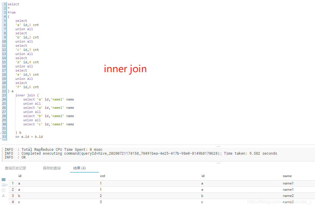 结果分析:通过group by去重得出预期结果,但其中会生成2个job,执行时间也相对增加了。