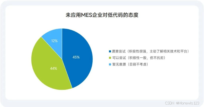以集团型企业为例,基于自身的IT技术能力和业务发展情况,越来越多的企业开始尝试借助低代码技术或平台进行MES软件的自主开发、合作开发或二次开发。据业内某权威机构的调研数据显示,已应用MES企业中,23%的企业表示已使用低代码技术或平台开发MES,56%的企业表示愿意尝试低代码技术或平台。未应用MES企业中,45%的企业表示愿意了解尝试低代码技术和平台。