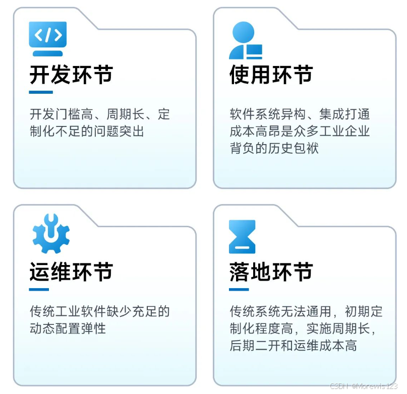 回首过去,研产供销服各个环节的工业软件,帮助制造企业迈出了数字化的第一步,为其业务全流程的提质增效带来深远的变革。然而,传统MES软件主要依托于物理机运行,封闭性、孤立性以及异构性特征明显,还面临着行业、企业个性化需求,与通用型产品之间的矛盾,衍生出项目实施难度大、周期长等问题,难以满足企业未来数字化应用不断拓展的需求。