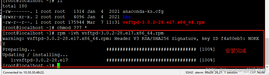 centos7.X下搭建FTP服务 # ftp://实现要求:在centos7.x中搭建FTP服务,需要建立多个用户,每个用户可访问的路径不同。一、安装操作1、检查是否已安装vsftp2、安装离线vsftpd安装包下载路径:RPM Search或者RPM resource vsftpdrpm -ivh vsftpd-3.0.2-28.el7.x86_64.rpm3、安装教程[root@localhost ~]# chmod 777 *[root@localhost ~]# rpm -..