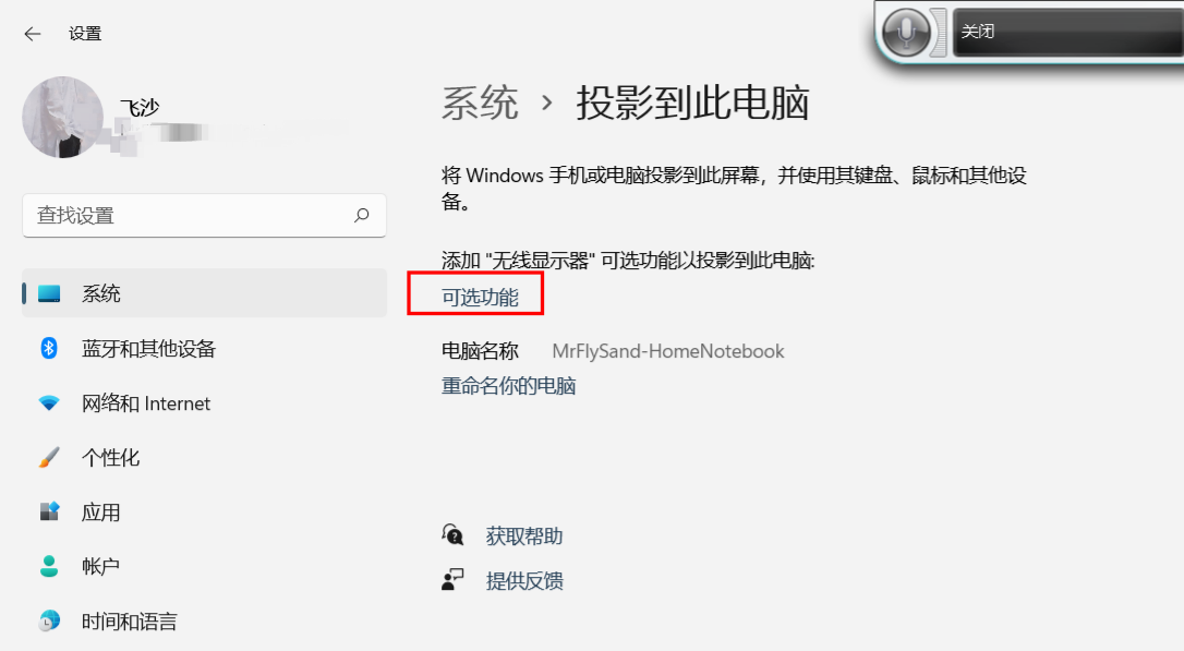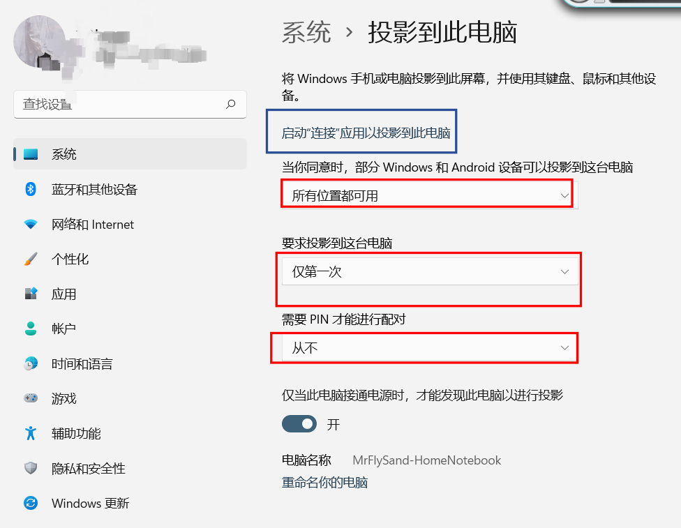 将手机和笔记本连接同一个wifi在电脑上按【win+i】进入【设置】——【系统】——【投影到此电脑】点击【可选功能】点击【查看功能】搜索【无线显示器】回到【投影到此电脑】,按照红色方框设置,点击蓝色【启动连接】打开手机,找到【投屏】,搜索到投屏的电脑