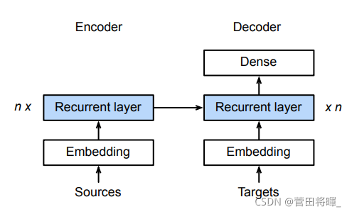 我们可以看到,我们的Source通过Embedding层后,进入了循环层(这里们是LSTM)。进过多次Encoder的循环层以后,将其输出输入Eecoder中。最后再由Decoder进行一个输出。