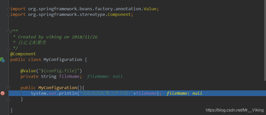 最近在用spingboot做一些项目,今天在搭建项目的时候本来是想要通过一个配置文件中的变量值来初始化java Bean中的变量,springboot就是基于注解来开发的嘛,所以用了一个@Value注解来注入配置文件中的变量。但是就在这个地方踩出好几个坑,所以记录一下,以免下次再犯同样的错误了。