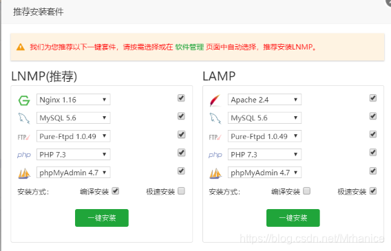 进入后会有推荐安装应用,在此处安装LNMP套装,推荐安装编译安装,上次安装的极速安装,出了一些问题。编译安装比较费时,但是稳定。