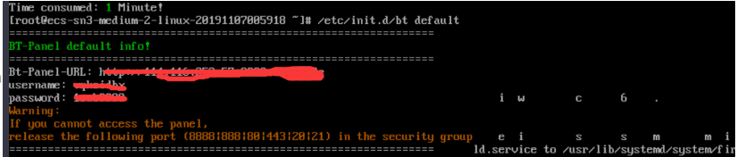 将第一个红色url输入到浏览器访问宝塔面板,输入初始用户名和密码