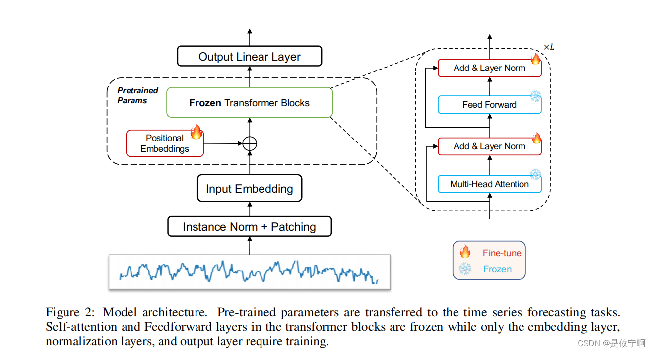 LLM4TS文献阅读:One Fits All:Power General Time Series Analysis by Pretrained LM 与NLP和CV中的统一模型可以执行不同的任务不同,特殊设计的方法在每个时间序列分析任务中仍然占主导地位,如分类、异常检测、预测和少镜头学习。阻碍对时间序列分析的预训练模型的开发的主要挑战是缺乏大量的训练数据。我们的结果表明,在自然语言或图像上的预先训练的模型可以在所有主要的时间序列分析中导致可比的或最先进的性能。除了在预先训练过的LM中使用的层范数外,我们还加入了一个简单的数据归一化块,反向实例范数Kim等人(2022),以进一步促进知识转移。我们的体系结构保留了预训练模型中的位置嵌入层和自我注意块。