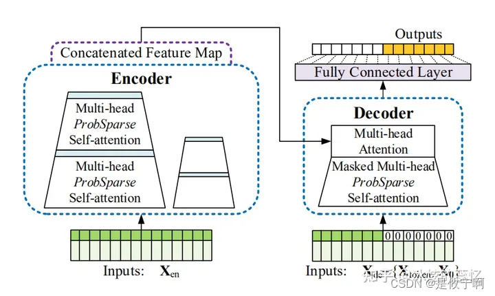 Informer: Beyond Efficient Transformer for Long SequenceTime-Series Forecasting && 常见项目代码结构解读 一、困难1.Transformer结构无法直接运用在LSTF, 因为存在二次时间复杂性、高内存使用率和编码器-解码器架构的固有限制等问题提出:模型总体结构:注意力机制self-attention:了解哪些词对这个词是重要的,词与词之间彼此的关系➡️词向量求点积,当两个词向量点积为0,表示两个词向量是垂直的,彼此间毫无关系;在一个方向,点击为1,完全相关➡️Q K 表示对一个句子从不同维度的理解,(Q*K得到词与词之间的相关性)*原始的语义V = 权重 * 原始的语意。