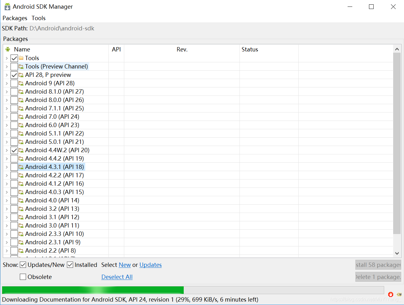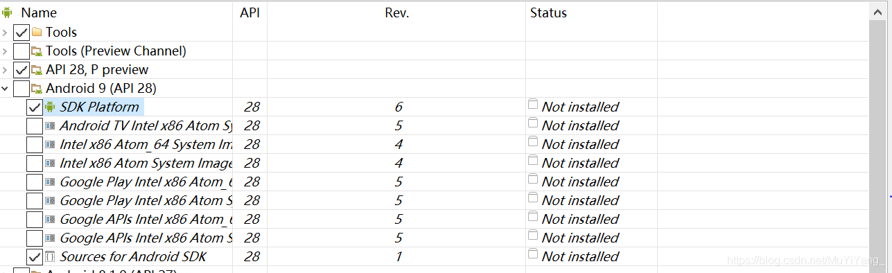 4.选择Tools中的所有,选择API15-API28中的SDK Platform和Sources for Android SDK
