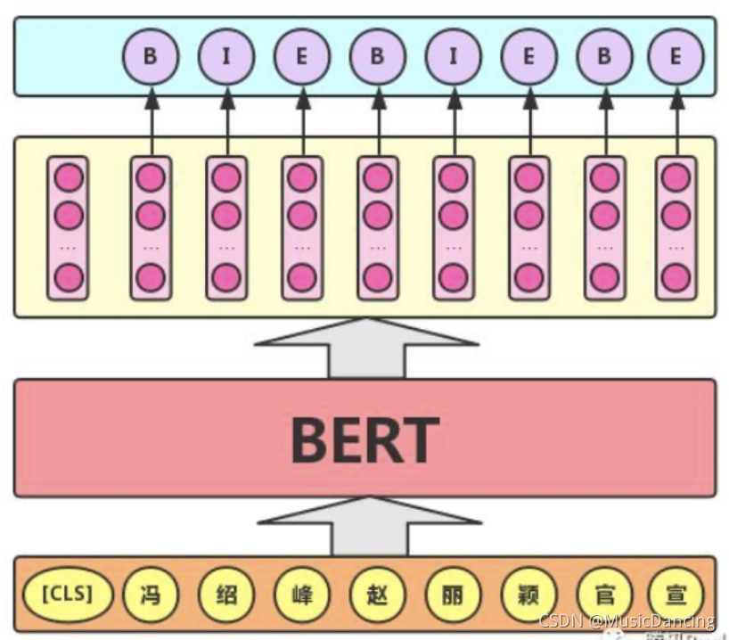 实际应用场景包括:中文分词&新词发现(标注每个字是词的首字、中间字或末字)、答案抽取(答案的起止位置)等。对于该任务,BERT模型利用文本中每个字对应的输出向量对该字进行标注(分类),如下图所示(B、I、E分别表示一个词的第一个字、中间字和最后一个字)。