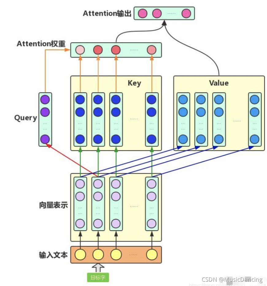 对于输入文本,需要对其中的每个字分别增强语义向量表示,因此,分别将每个字作为Query,加权融合文本中所有字的语义信息,得到各个字的增强语义向量,如下图所示。在这种情况下,Query、Key和Value的向量表示均来自于同一输入文本。