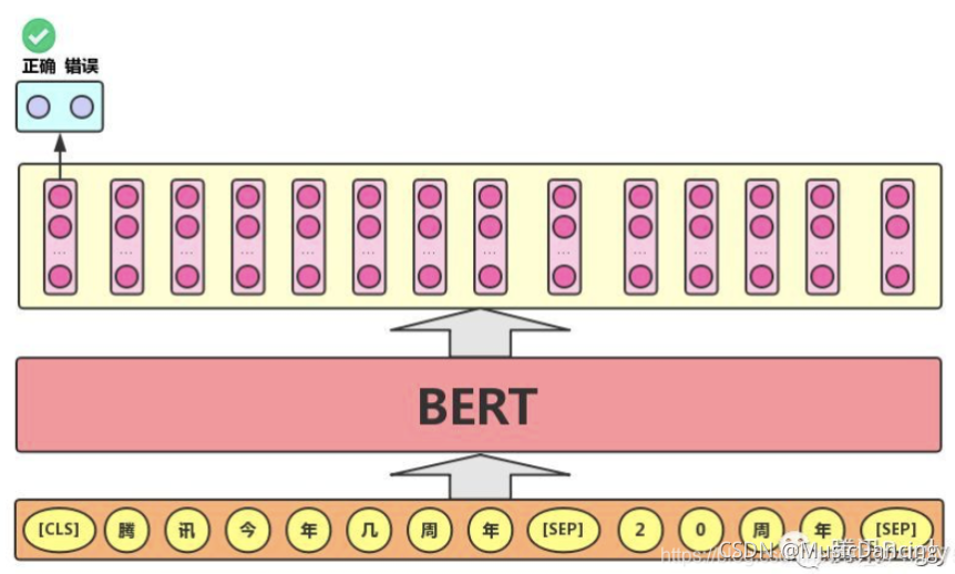 实际应用场景包括:问答(判断一个问题与一个答案是否匹配)、语句匹配(两句话是否表达同一个意思)等。对于该任务,BERT模型除了添加[CLS]符号并将对应的输出作为文本的语义表示,还对输入的两句话用一个[SEP]符号作分割,并分别对两句话附加两个不同的文本向量以作区分,如下图所示。