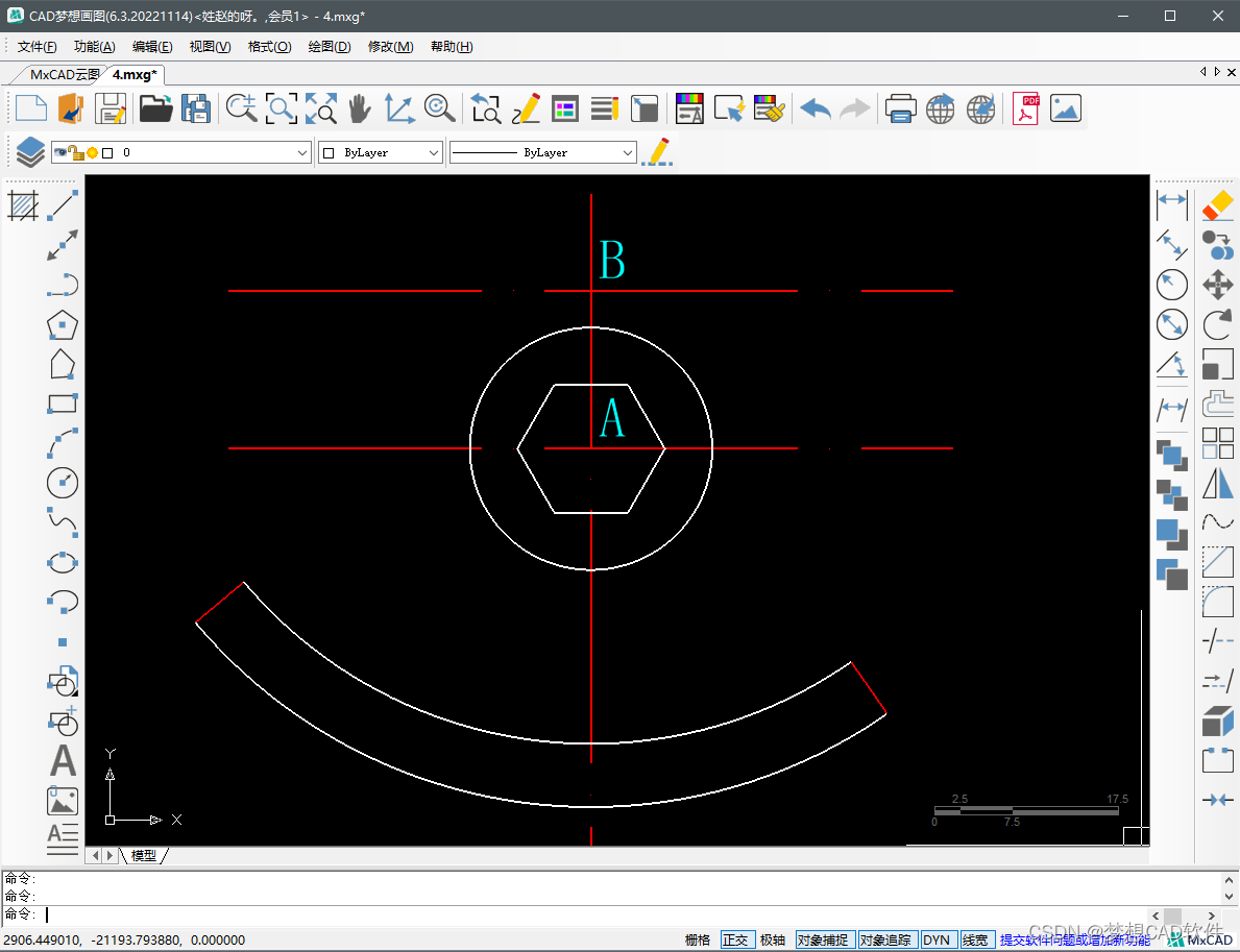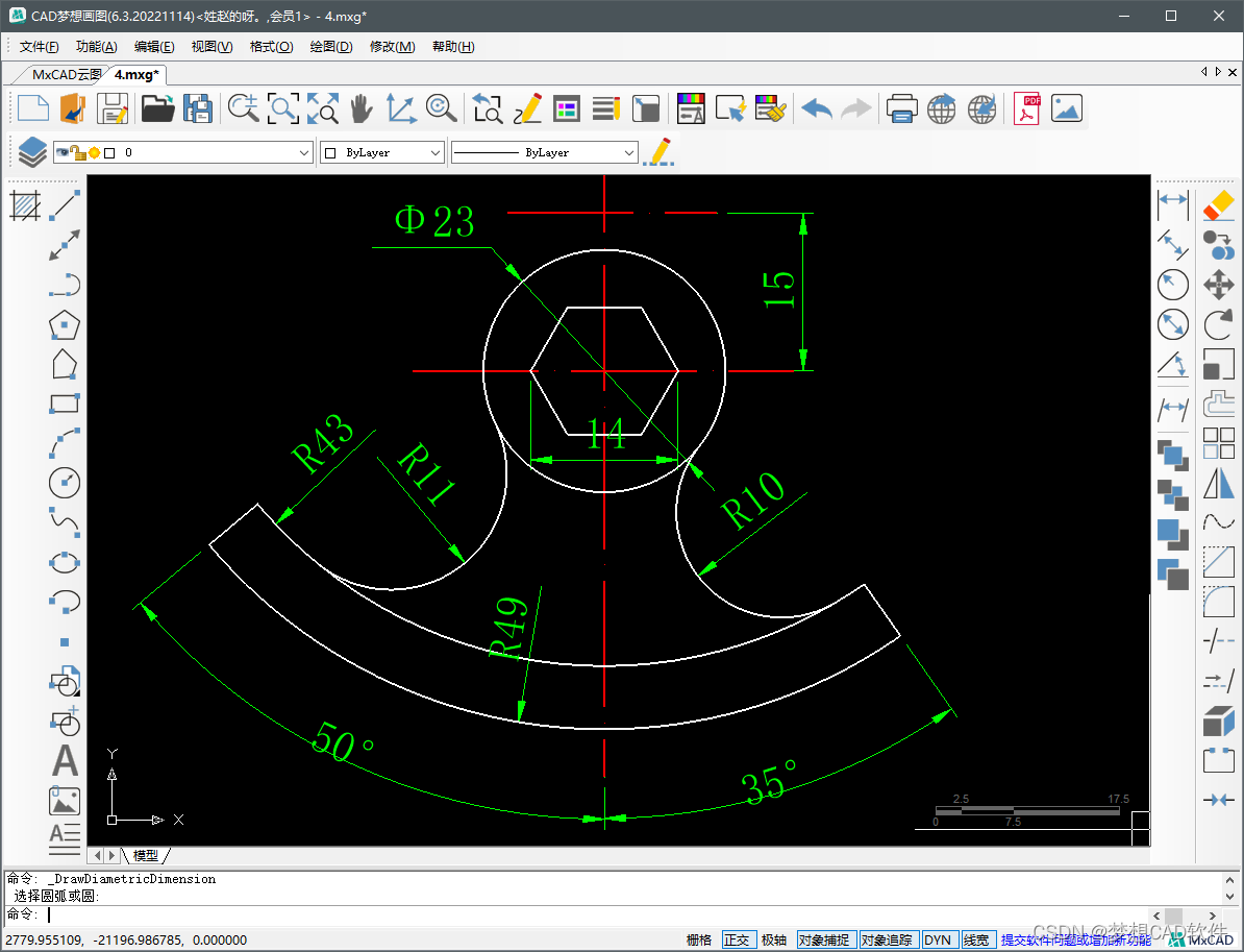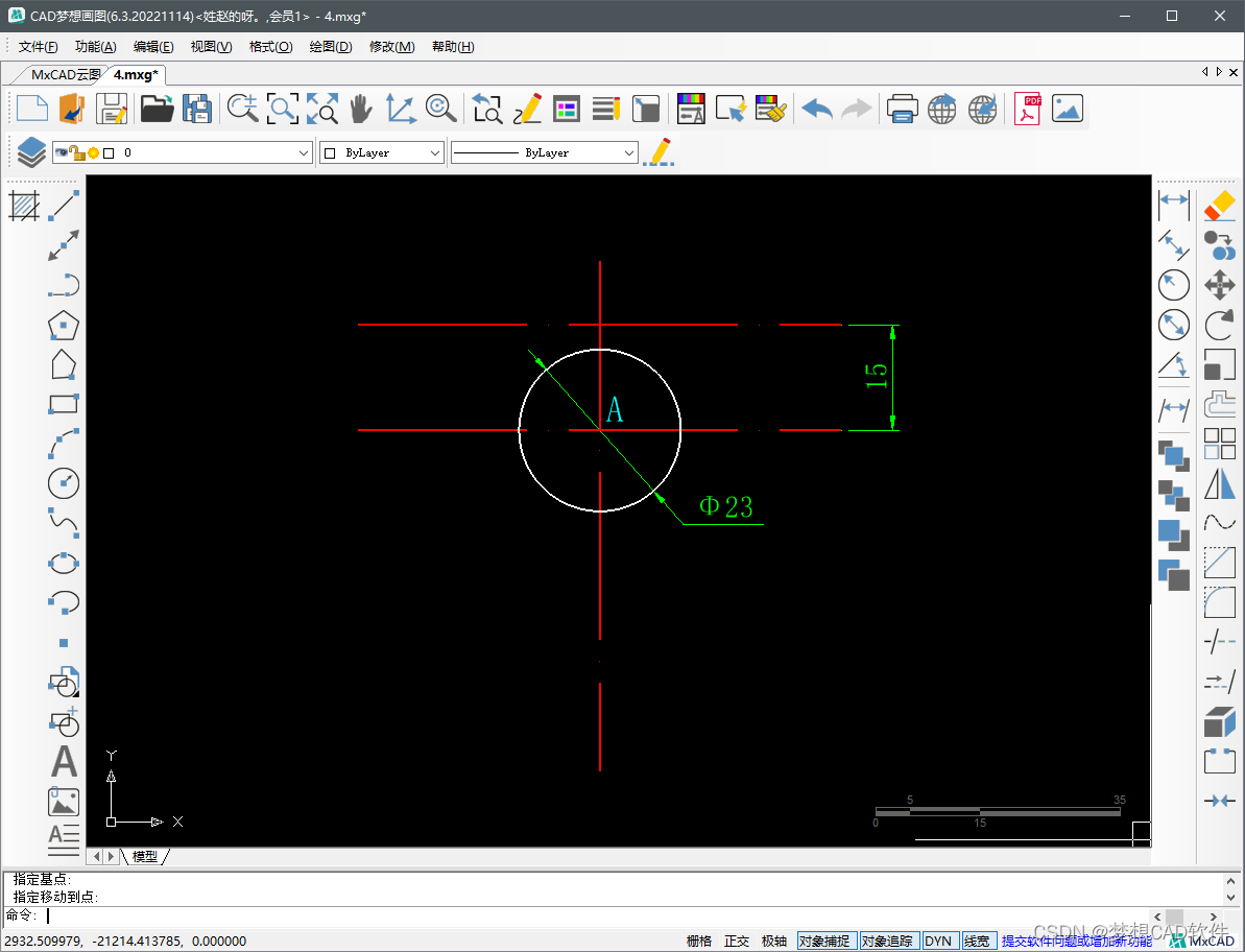 2.使用CAD圆命令,以A点为圆心绘制一个直径为23的圆