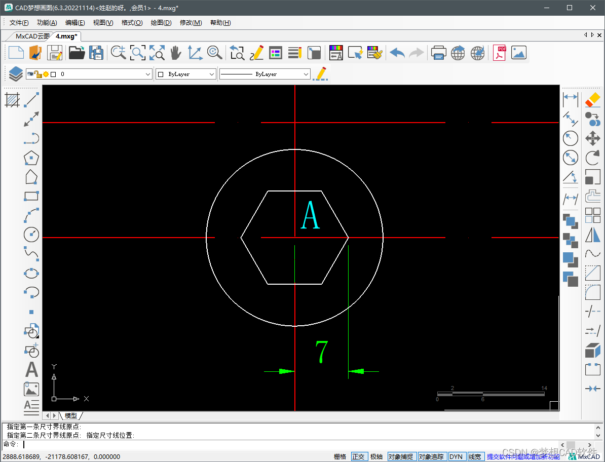 3.使用CAD多边形命令绘制一个半径为7的内接于圆的正六边形