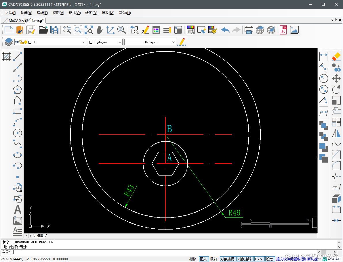 4.再次使用圆命令以B点为圆心分别画半径43和半径49的圆