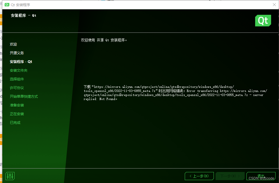 在线安装qt时会出现报错: