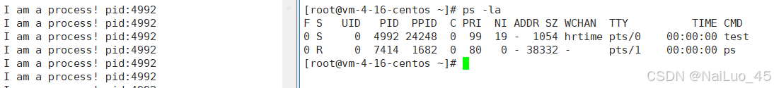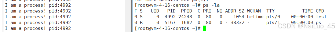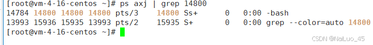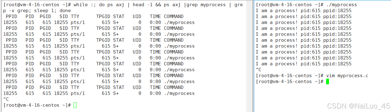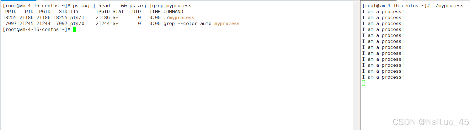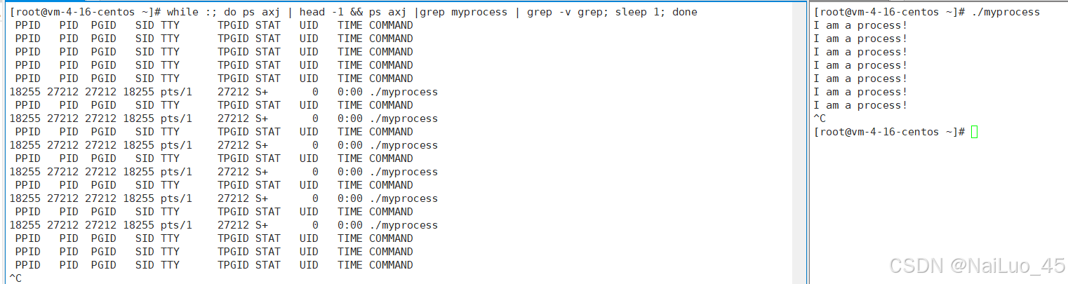 复制会话,再另一个会话中输入ps axj | head -1 && ps axj |grep myprocess 查看进程