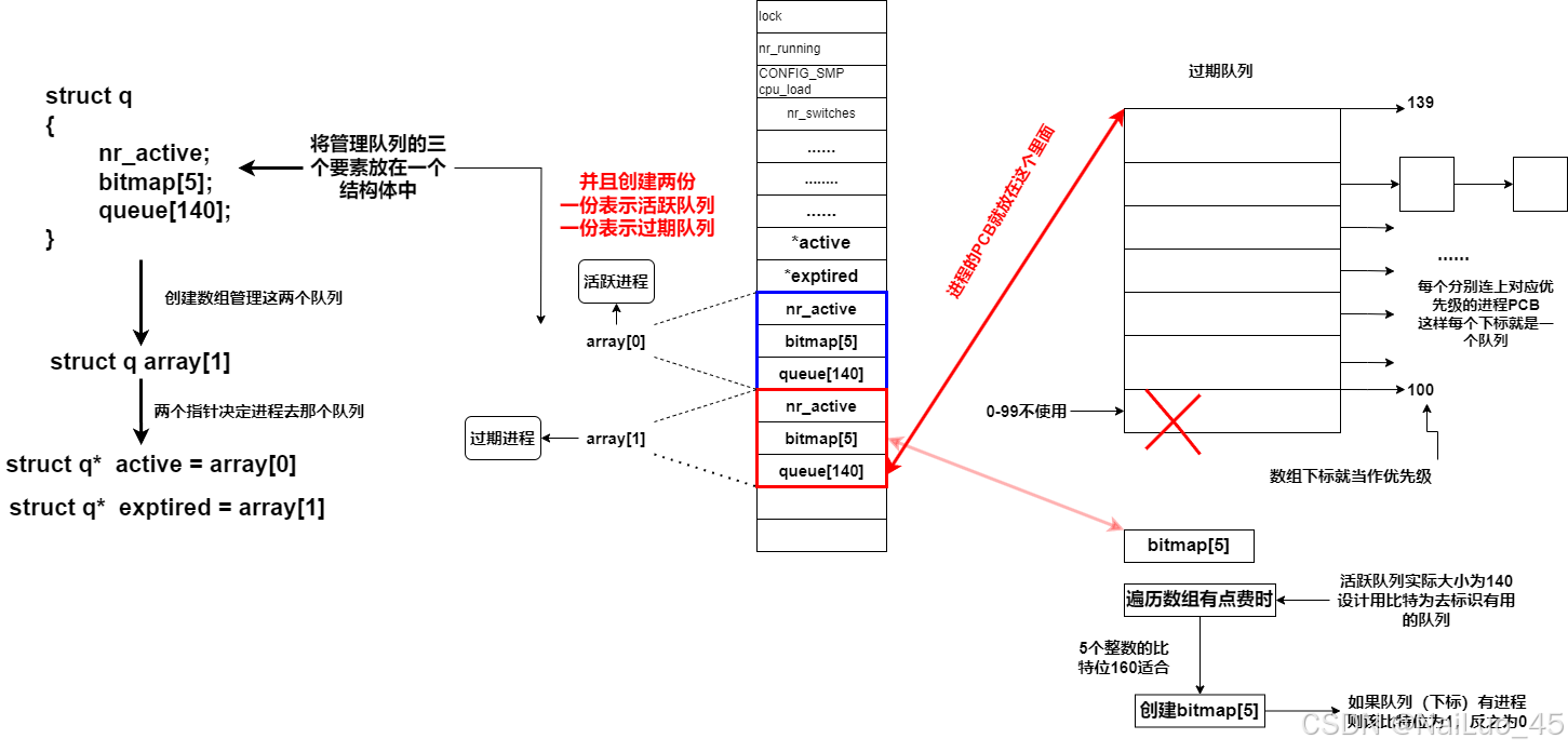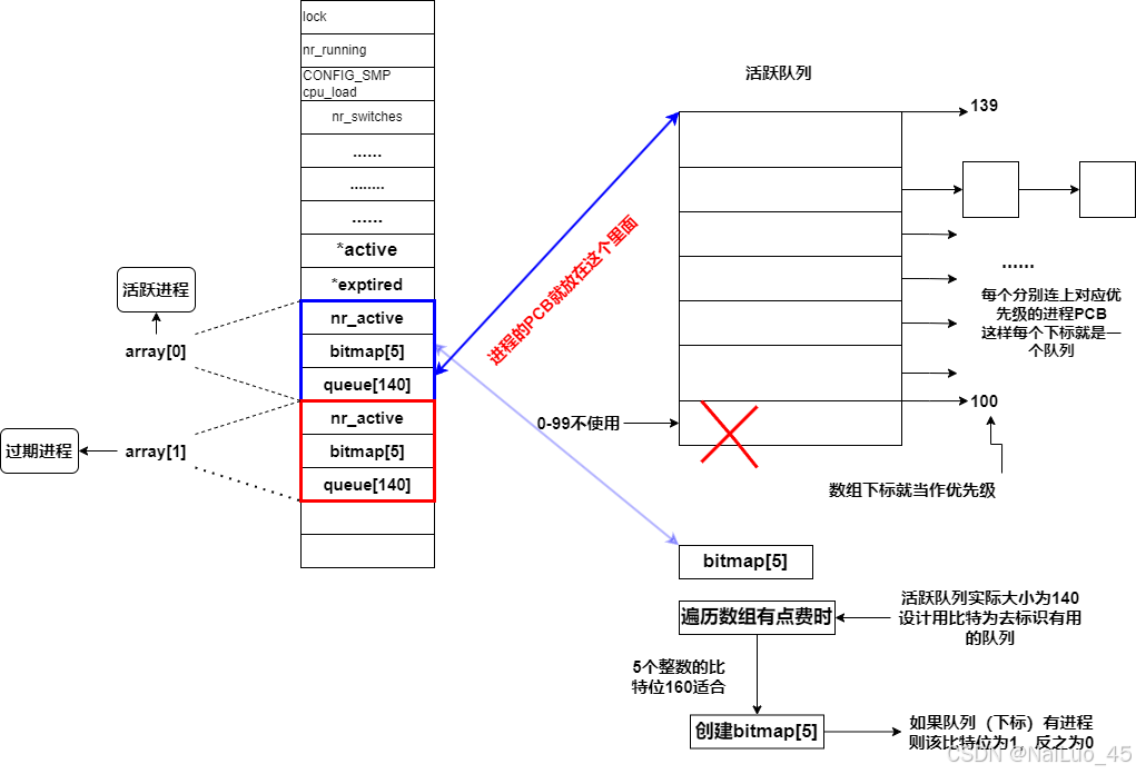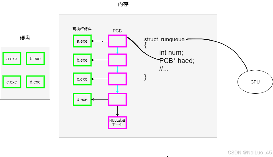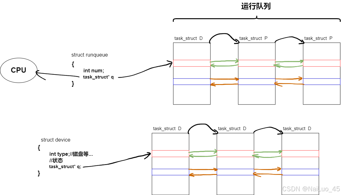 如图所示,CPU去调度可执行程序时,也不是直接去找可执行程序,操作系统会提过一个运行队列表,里面含有程序数量和指向以一个PCB对象的指针,当然还有不全部列出;CPU是去找PCB而不是程序!CPU是这样,操作系统也是这样,都不直接访问可执行程序。