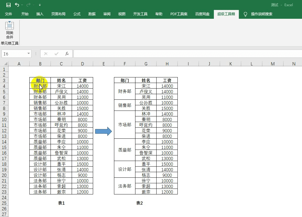 工作中,我们有时会遇到这样一种需求,需要将某一列中内容相同的单元格进行合并。例如下图中,需要将相同的部门进行合并,由表1转换为表2。如果你需要经常处理这种需求,就可以自定义一个功能放到Excel的自定义功能区里。比如我们把这种需求叫做“同类合并”