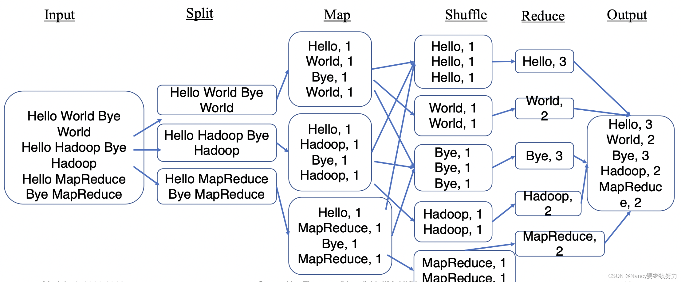 Split和Map环节的各块数据,在不同的计算机中处理;经过MapReduce的shuffle环节,再将不同单词的词频总计任务分配给不同的reducer(计算机);最后由reduce到output环节再merge到一台计算机上。最初的MapReduce模型可能效率跟不上大数据需求,但是这种编程思想是值得学习的。参考知乎问题:mapreduce为什么被淘汰了? - 知乎