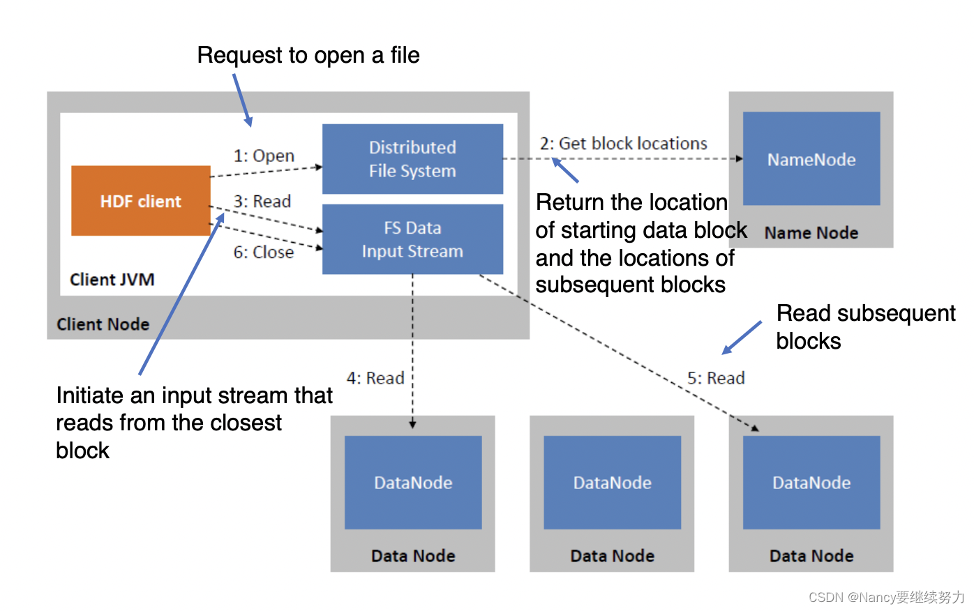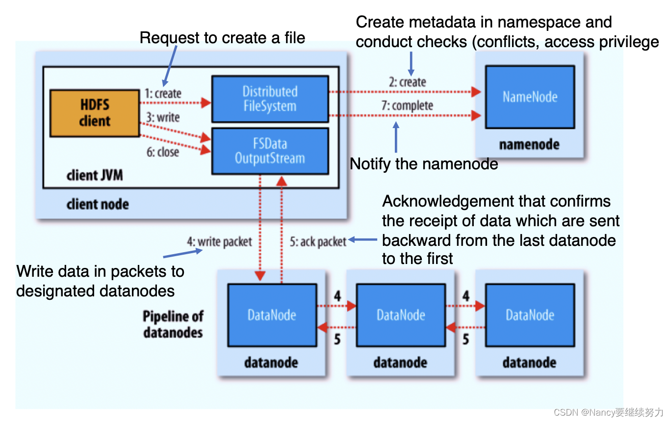 Hadoop系统分为两部分,HDFS(hadoop distributed file system) 和 MapReduce(processing framework)。 HDFS是分布式文件系统,可以进行创建、删除、移动、重命名文件、读/写文件等操作。有一个NameNode和多个DataNode,NameNode负责管理文件系统的名字空间和控制外部客户机的访问;DataNode 提供存储块,存储在 HDFS 中的文件被分成块,然后将这些块复制到多个计算机中(DataNode)中。NameNode 决定是否将文件映射到 DataNode 上的复制块上。HDFS 的主要目的是支持以流的形式访问写入的大型文件。下图为HDFS的读,写操作过程。