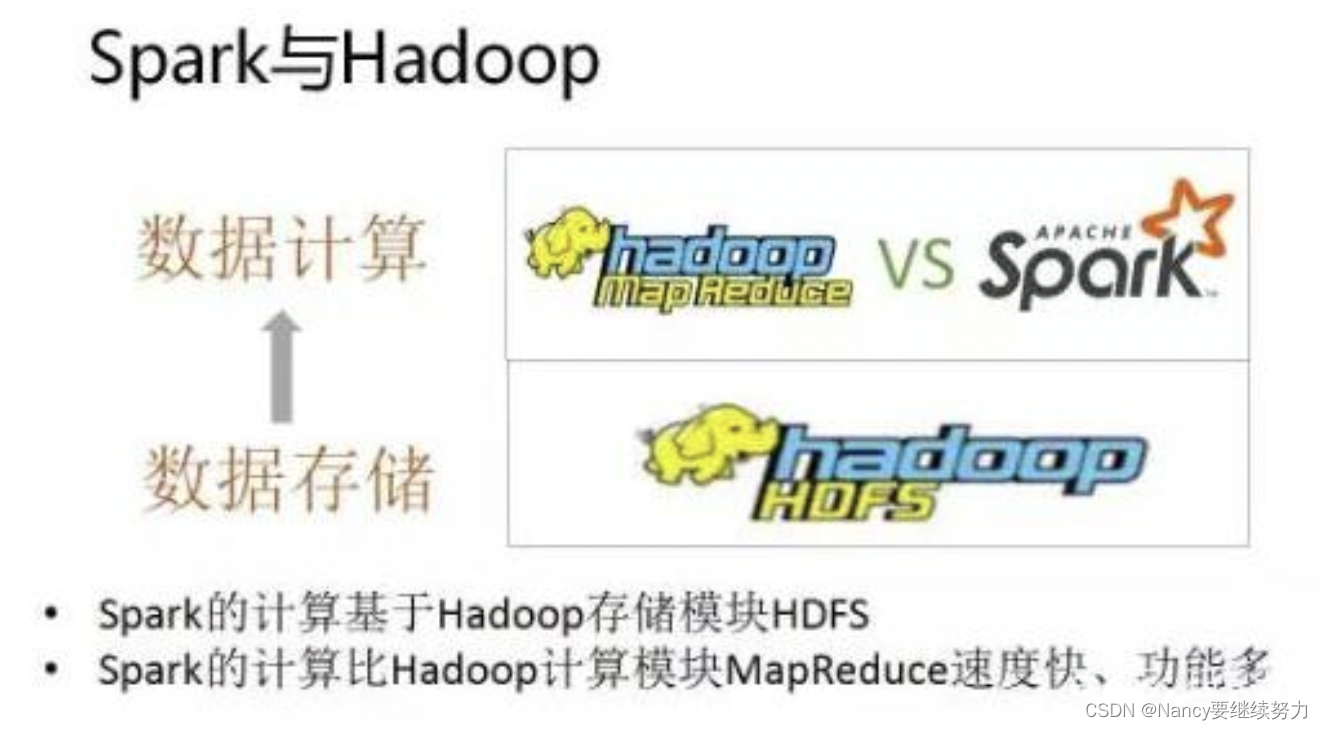 Spark是在Hadoop系统上的改进产物。它是专为大规模数据处理而设计的快速通用的计算引擎,提供了一个全面、统一的框架用于管理各种有着不同性质(文本数据、图表数据等)的数据集和数据源(批量数据或实时的流数据)的大数据处理的需求。Spark本身并没有提供分布式文件系统,因此其分析大多依赖于Hadoop的分布式文件系统HDFS;Hadoop的MapReduce与spark都可以进行数据计算,而相比于Mapreduce,spark的速度更快并且提供的功能更加丰富。关系如下: